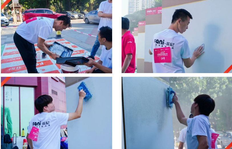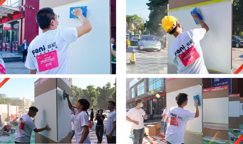随着主持人一声令下,菲尼艺术涂装工大赛正式开赛。赛场内瞬间进入紧张而有序的状态:一面面标准墙板整齐排开,菲尼艺术涂料产品整装待用,选手们精神专注、动作利落。菲尼艺术涂料优异的延展性、丰满度与色彩表现力,也在选手们的巧手之下得到充分展现。